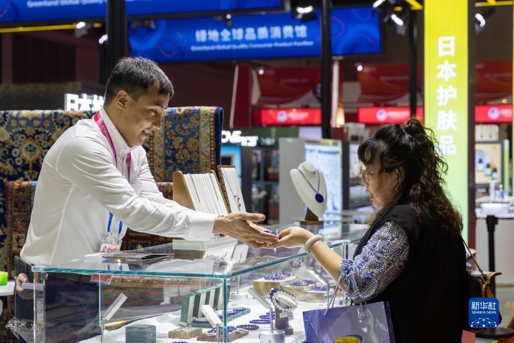 11月5日,阿里(左)在第六届进博会消费品展区向参观者介绍阿富汗青金石饰品。