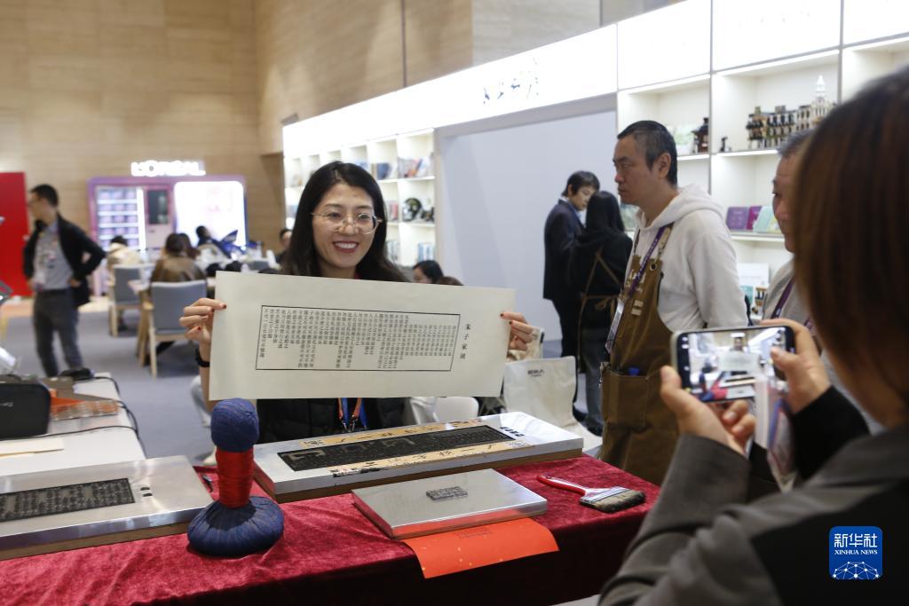 11月8日,在进博会新闻中心,记者在体验活字拓印。