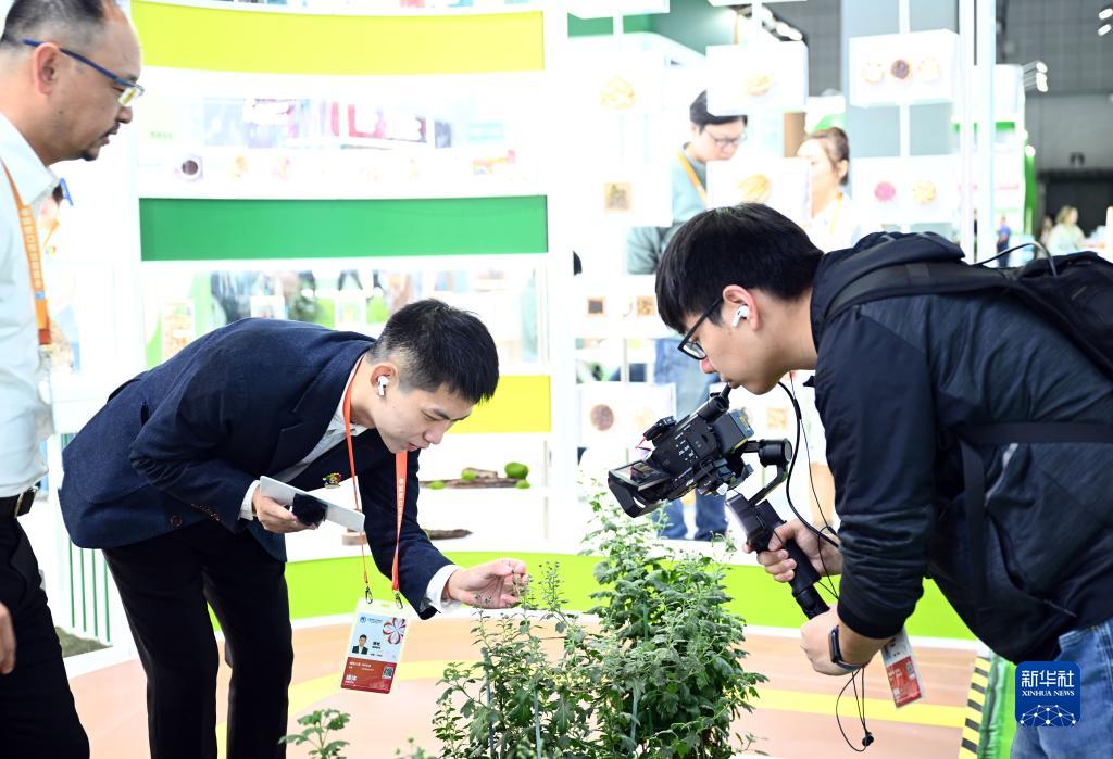 11月7日,澎湃新闻记者在展位上拍摄采访。