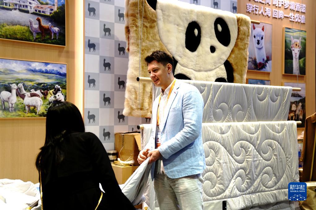 11月8日,在第六届进博会消费品展区,太平洋羊驼家纺联合创始人迪马(右)向观众介绍羊驼被。
