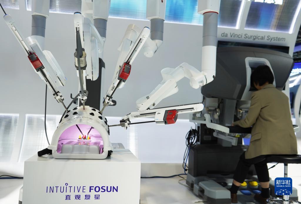 11月7日,在第六届进博会医疗器械及医药保健展区复星健康展台,工作人员演示操作国产达芬奇手术机器人。
