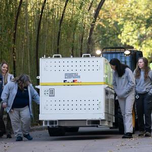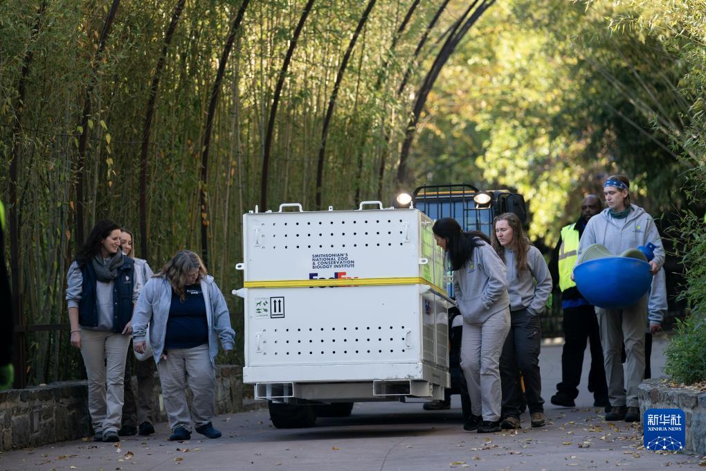 11月8日,在美国华盛顿史密森学会国家动物园,装有大熊猫的箱子准备被运往机场。