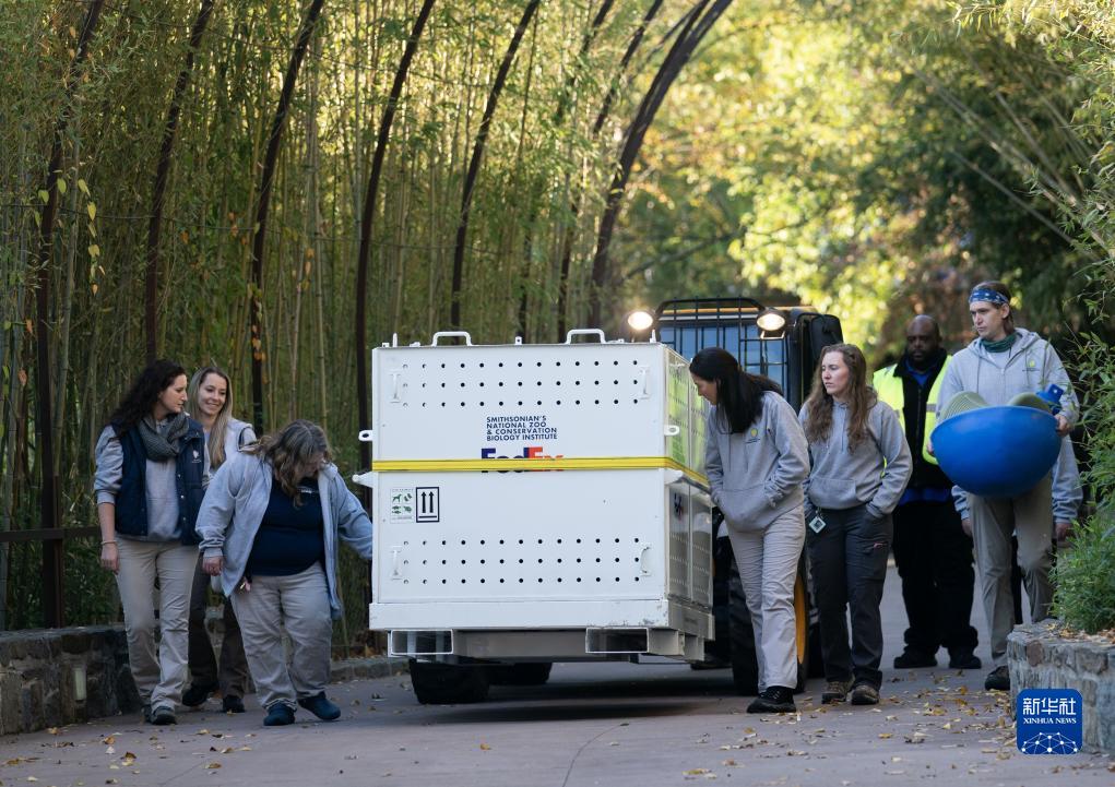 11月8日,在美国华盛顿史密森学会国家动物园,装有大熊猫的箱子准备被运往机场。