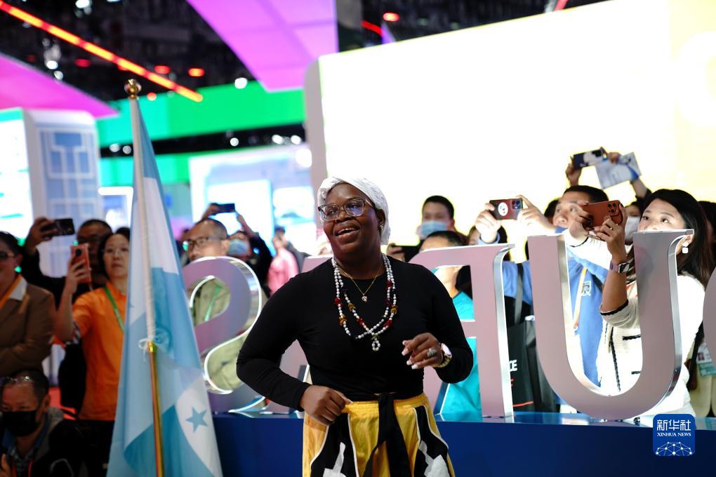 11月7日,在第六届进博会国家展区,来自洪都拉斯的歌舞表演吸引观众观看拍摄。