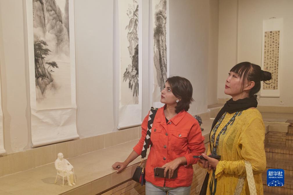 7日,巴基斯坦首都伊斯兰堡一座展厅里人来人往,来自中国的水墨书画、雕塑、油画等作品陈列其中,几名观众驻足在一幅书画作品前,细细品味。