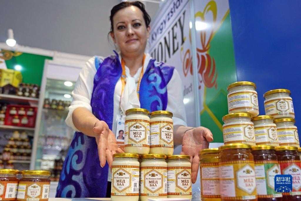 11月7日,在第六届进博会上,展商展示吉尔吉斯斯坦蜂蜜产品。