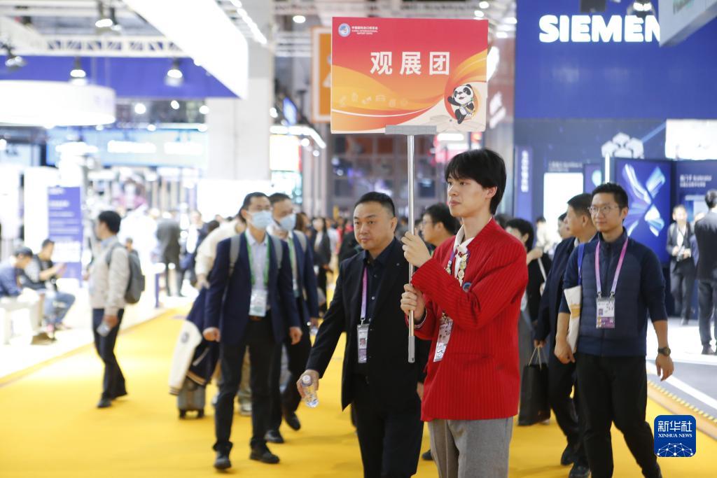 11月7日,在第六届进博会上,上海理工大学志愿者潘奕帆引导观展团参观展区。