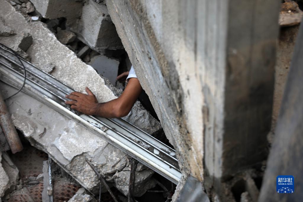 11月9日,在加沙地带南部城市汗尤尼斯,人们在遭以色列袭击后的建筑废墟中实施救援。