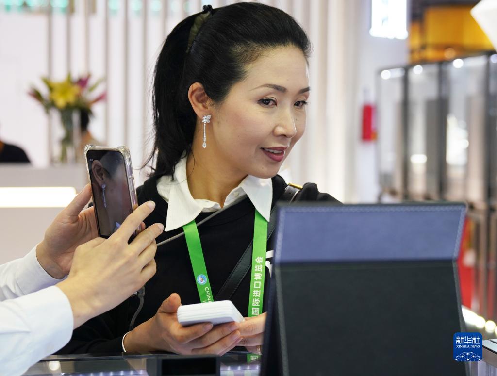 11月9日,在第六届进博会消费品展区EJI(雅宝珠宝国际有限公司)展台,参观者试戴钻石耳饰。