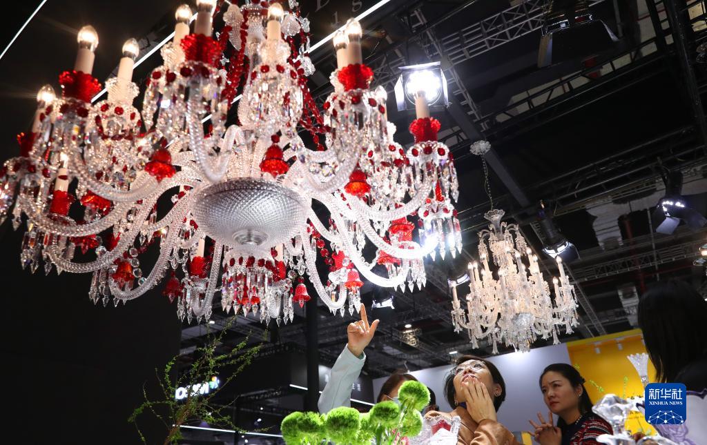 11月10日,在第六届进博会上,参观者在捷克水晶灯下驻足观看。