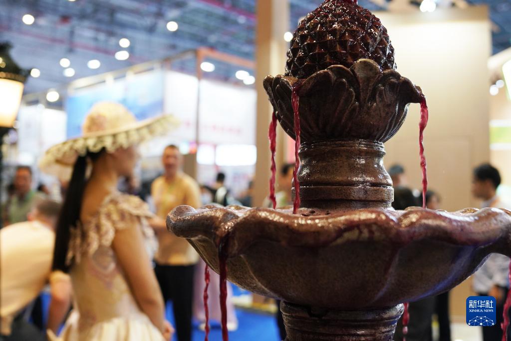 11月8日在第六届进博会食品及农产品展区拍摄的红酒喷泉。