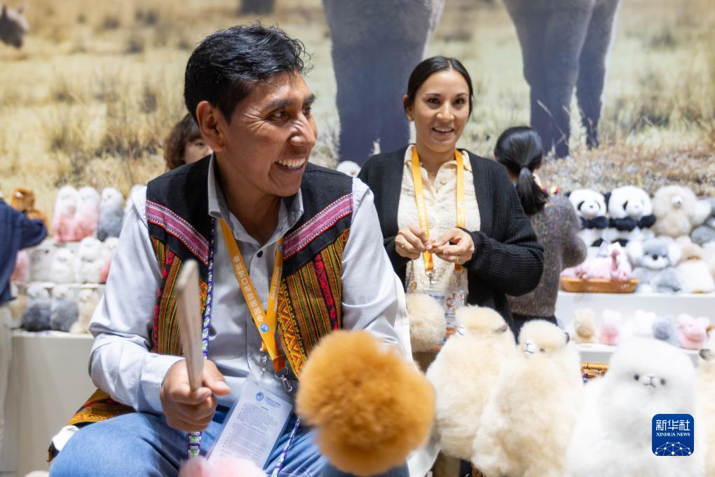 11月7日,首次参加进博会的秘鲁羊驼毛制品手艺人奥斯瓦尔多·马马尼(前)在“温暖驼”品牌展台宣传羊驼玩偶。