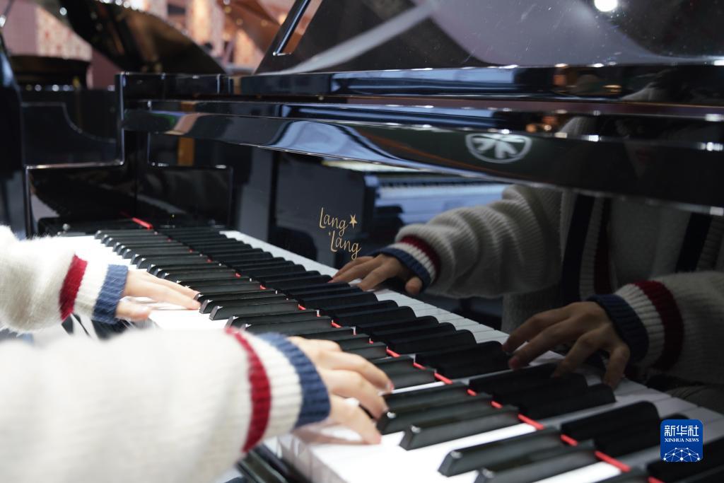 11月9日,在第六届进博会消费品展区,参观者在施坦威展台弹奏钢琴。