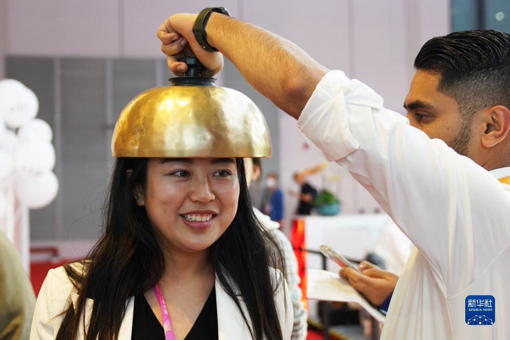 11月9日,在第六届进博会消费品展区,参观者在感受敲击颂钵的声音。