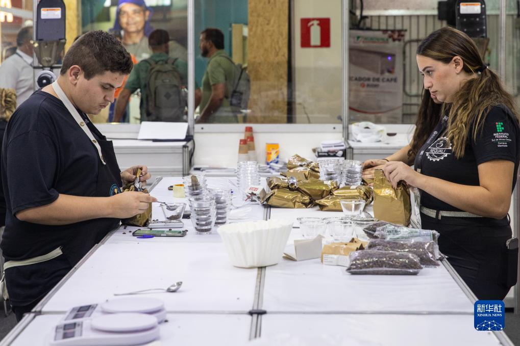 11月9日,在巴西贝洛奥里藏特举行的咖啡周上,工作人员包装咖啡。