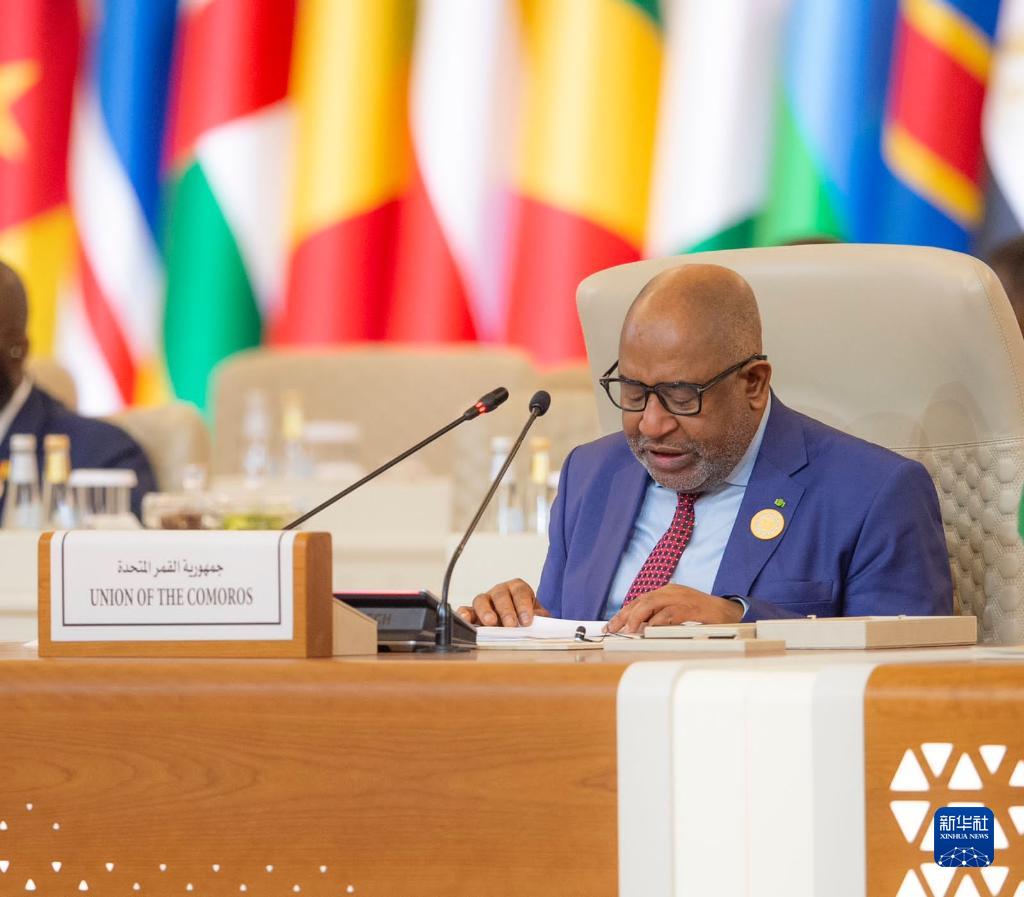 11月10日,在沙特首都利雅得,非洲联盟轮值主席、科摩罗总统阿苏马尼在首届沙特阿拉伯-非洲峰会上讲话。新华社发(沙特通讯社供图)