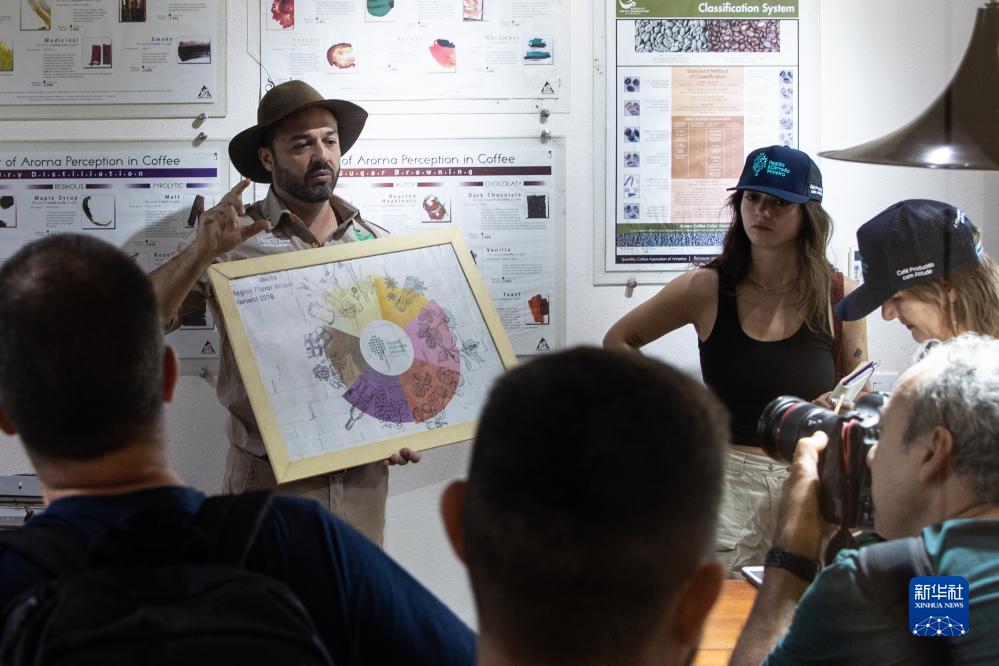 11月8日,在巴西东南部米纳斯吉拉斯州塞拉杜地区的巴里纳斯农场里,农场主人蒂亚戈·阿尔维斯(左)向参观者介绍咖啡。新华社记者 王天聪 摄