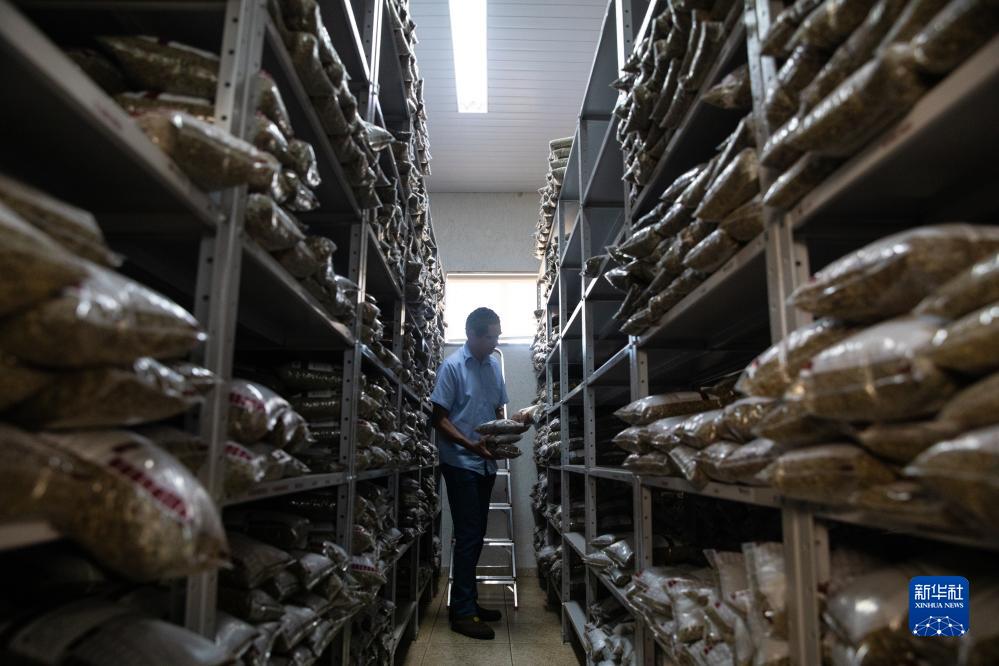 11月7日,在巴西东南部米纳斯吉拉斯州塞拉杜地区的一家咖啡种植者合作社里,工作人员在咖啡豆样本仓库里为咖啡豆装袋。新华社记者 王天聪 摄