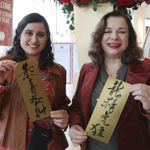 2023年2月5日,在美国旧金山戴维斯音乐厅,两名欣赏中国农历新年音乐会的观众展示福帖。新华社发(刘艺霖摄)