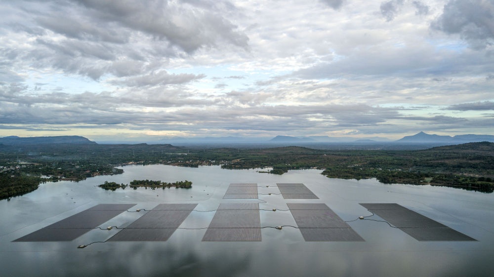 这是2022年12月8日在泰国乌汶府诗琳通水库拍摄的浮体光伏项目(无人机照片)。中泰两国联合修建的浮体光伏项目2021年10月投入商业运营。中国制造的电池板不断将日光转化为清洁电能,输送至当地千家万户。