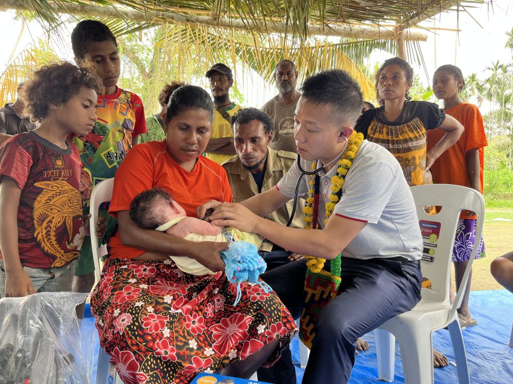 2023年8月5日,在巴布亚新几内亚中央省的一个村庄里,第12批援巴新中国医疗队副队长、新生儿科副主任医师刘振球为婴儿泰乐听诊检查。泰乐出生时患有重症,一度生命垂危,经过刘振球与当地医护人员的救治最终痊愈。从2002年起,中国连续向巴新派出12批医疗队,为提高巴新医疗卫生水平作出积极贡献。