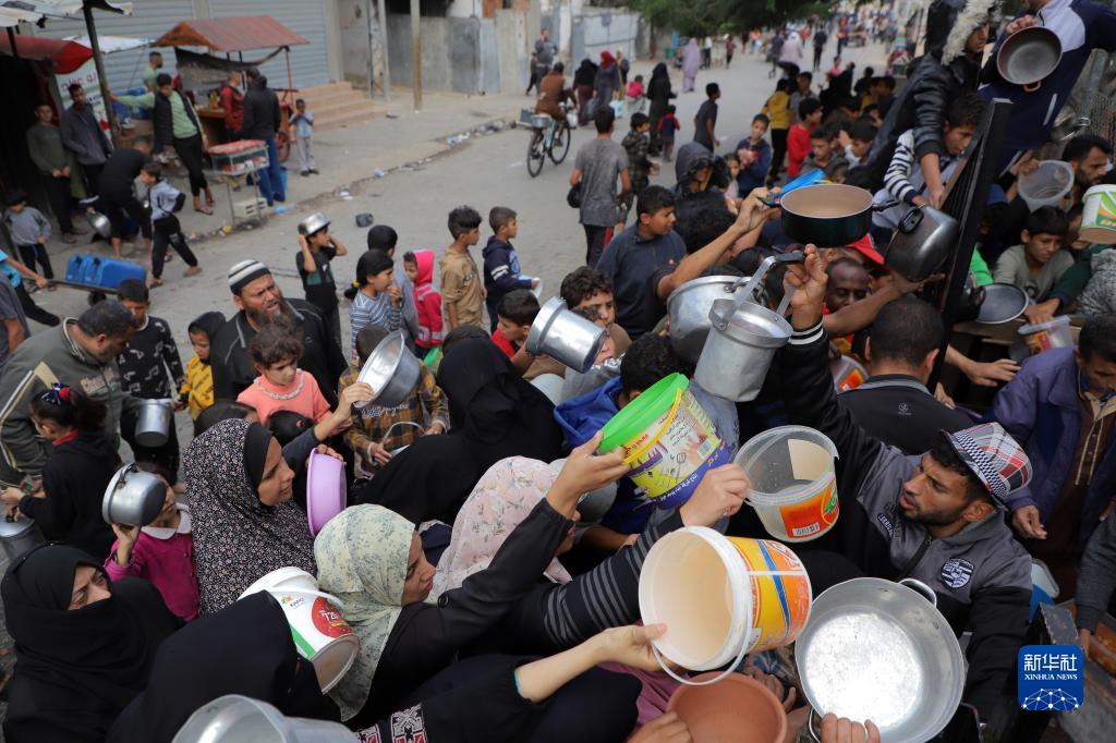 11月19日,在加沙地带南部城市拉法,人们领取救济食物。