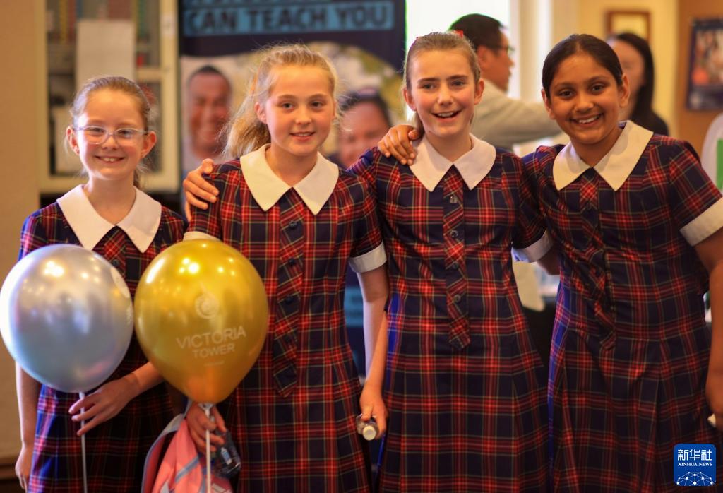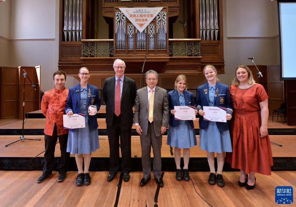 11月18日,在澳大利亚阿德莱德,中国驻阿德莱德总领事李东(中),澳中文化交流促进会荣誉会长约翰·塔普林(左三)与“澳洲人唱中文歌”比赛一等奖获得者沃尔福德圣公会女子学校“甜蜜蜜”组合合影。新华社发(倪炯摄)
