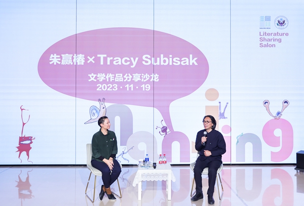 11月19日,南京知名书籍设计师、“自然观察者”朱赢椿(左二)与美国畅销童书作家特雷西·苏比萨克(左一)在2023“中国南京周”延展活动进行对话。(新华网北美公司供图)