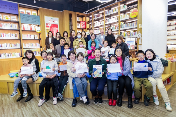 11月19日,在2023“中国南京周”延展活动中,美国畅销童书作家特雷西·苏比萨克(前排左五)与小读者们合影。(新华网北美公司供图)