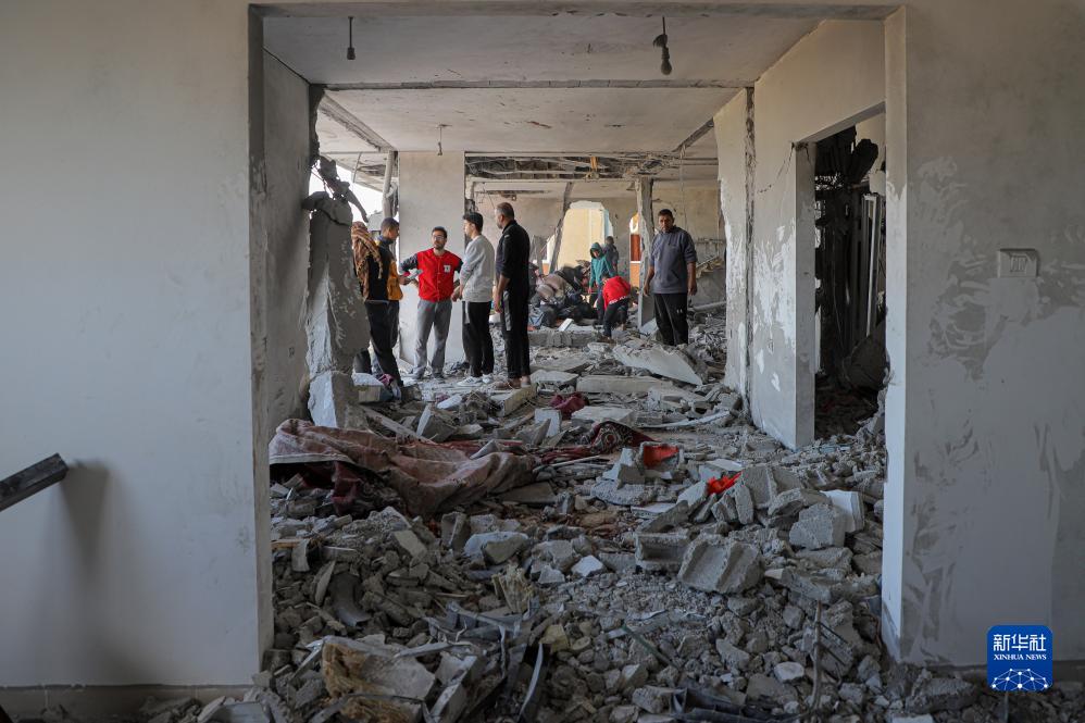 11月22日,在加沙地带南部城市汗尤尼斯,巴勒斯坦人查看遭以色列袭击后的建筑废墟。