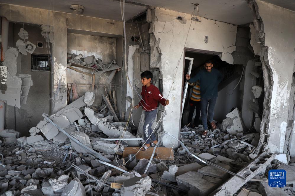 11月22日,在加沙地带南部城市汗尤尼斯,巴勒斯坦人查看遭以色列袭击后的建筑废墟。