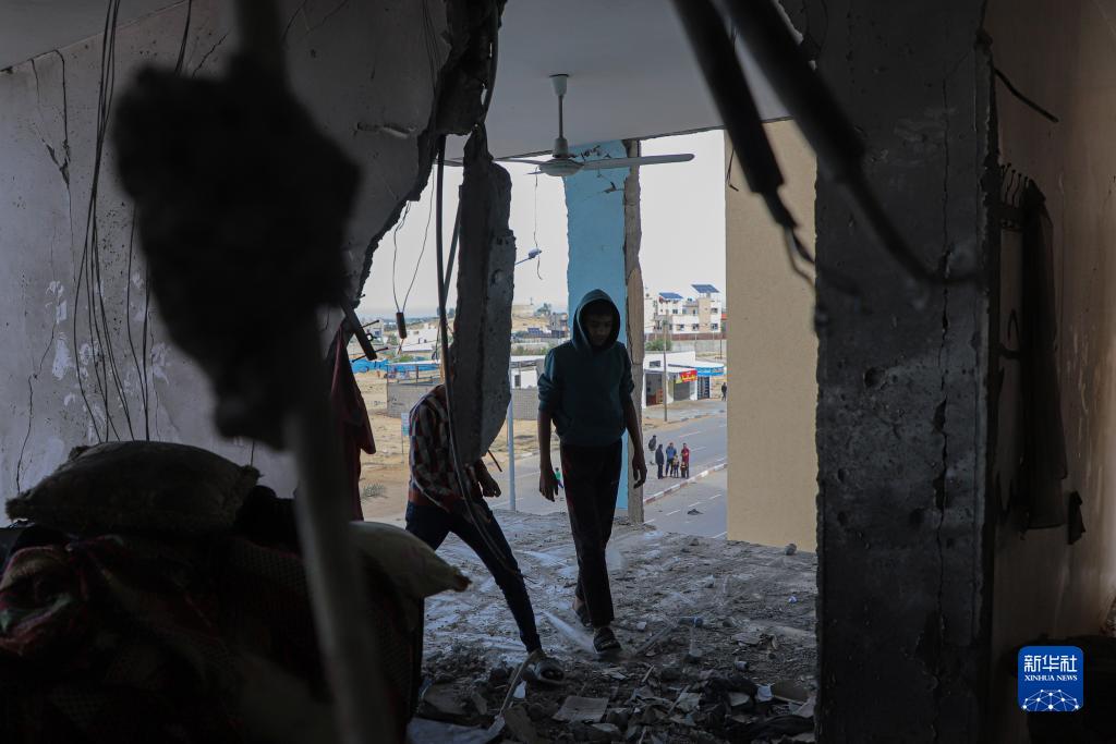 11月22日,在加沙地带南部城市汗尤尼斯,巴勒斯坦人查看遭以色列袭击后的建筑废墟。