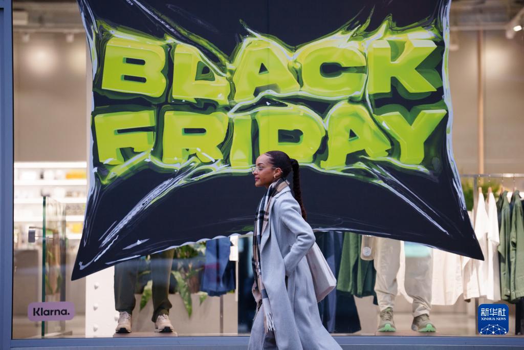 11月22日,在英国曼彻斯特,一名女子走过“黑色星期五”促销广告。