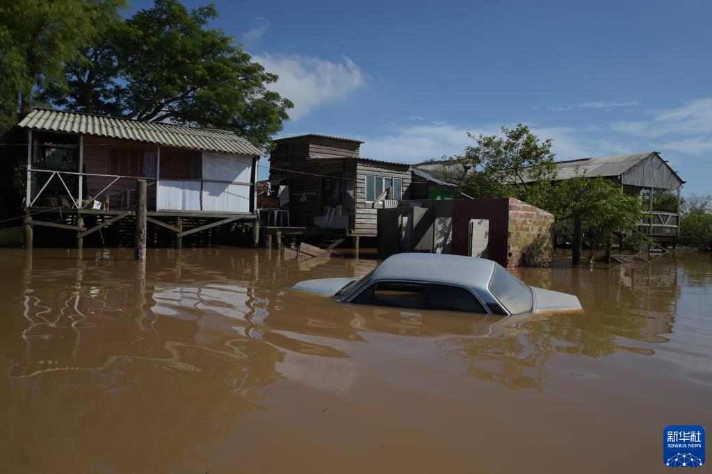 11月24日,在巴西南里奥格兰德,车辆和房屋淹没在洪水中。
