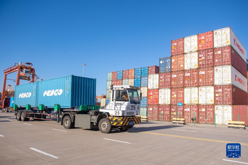 11月22日,装载集装箱的卡车行驶在温州港状元岙集装箱码头内。