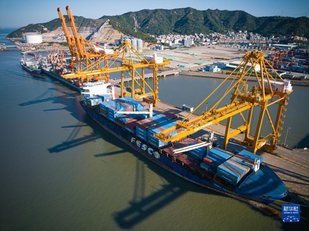 11月22日,货轮停靠在温州港状元岙集装箱码头卸载集装箱(无人机照片)。