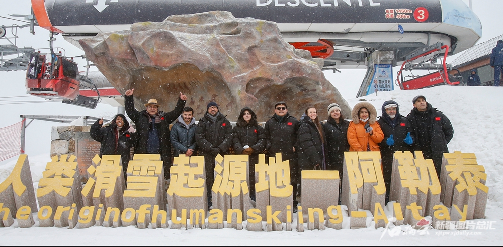 11月25日,上合组织2023旅游年论坛嘉宾在阿勒泰将军山国际滑雪度假区合影留念。天山网-新疆日报记者 谢龙摄