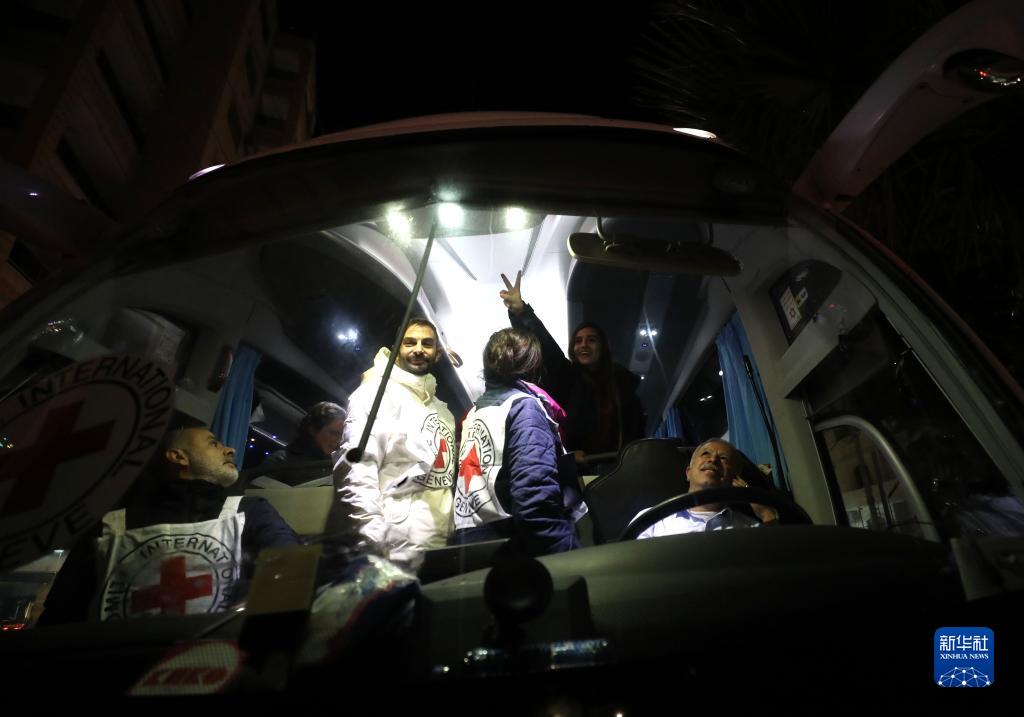 11月28日晚,载有获释巴勒斯坦被关押人员的大巴抵达约旦河西岸城市拉姆安拉。