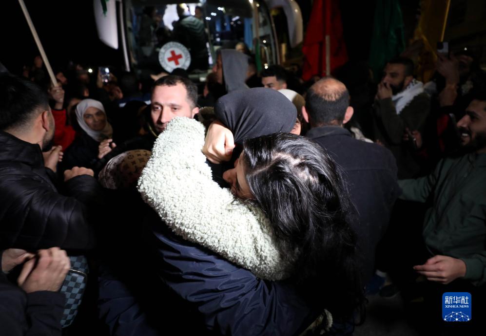11月29日凌晨,在约旦河西岸城市拉姆安拉,获释的巴勒斯坦人与亲人团聚。