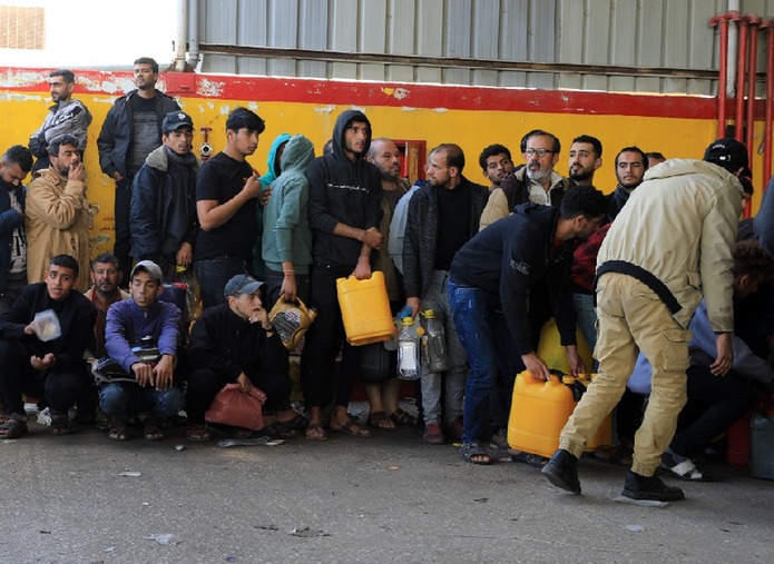 11月28日,在加沙地带南部城市汗尤尼斯一加油站,人们排队等待补充燃料。新华社发(亚西尔·库迪摄)