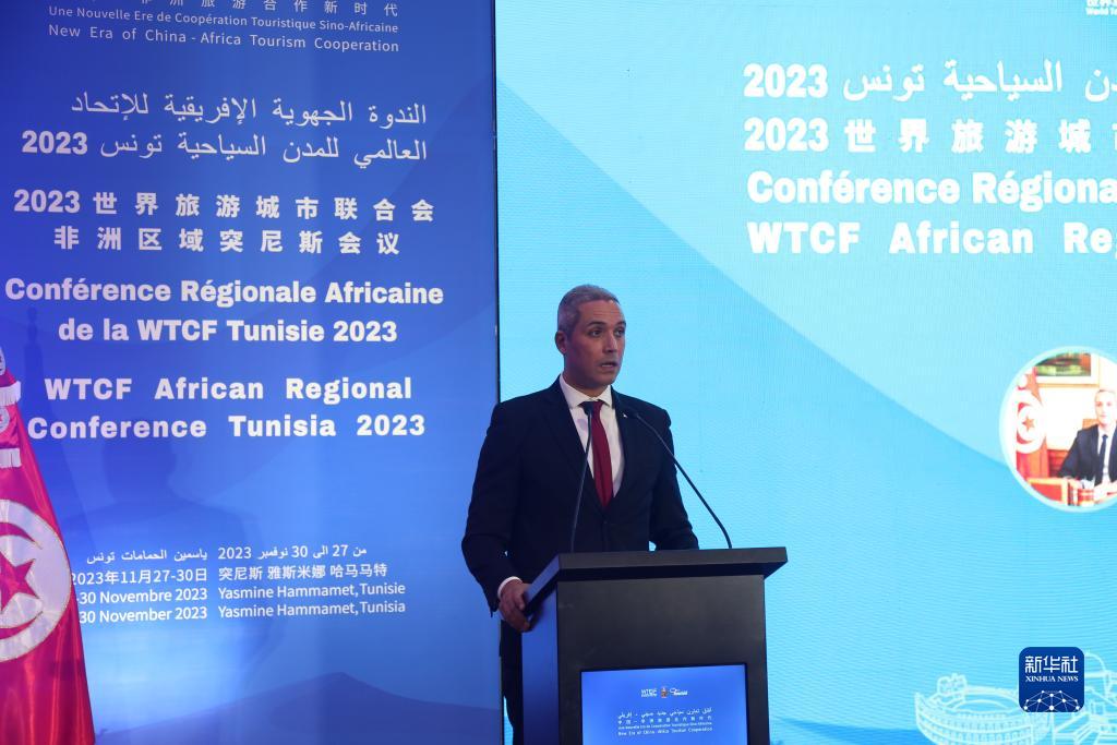 11月29日,在突尼斯东部海滨城市哈马马特,突尼斯旅游部长贝勒哈桑在2023世界旅游城市联合会非洲区域会议上讲话。新华社记者黄灵摄