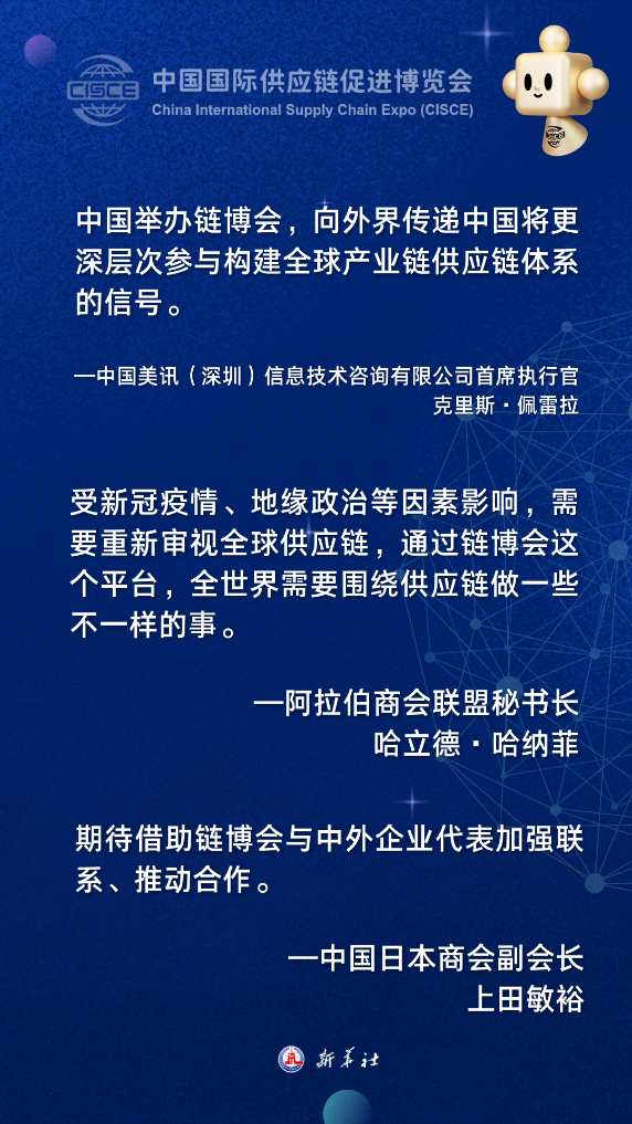 首届中国国际供应链促进博览会11月28日至12月2日在北京举行。作为全球首个以供应链为主题的国家级展会,链博会集贸易促进、投资合作、创新集聚、学习交流功能于一体。与会多国人士表示,链博会的举办展现了中国维护全球产业链供应链安全稳定的担当,期待借助这一平台巩固和加强全球产业链供应链合作,助力世界经济复苏。