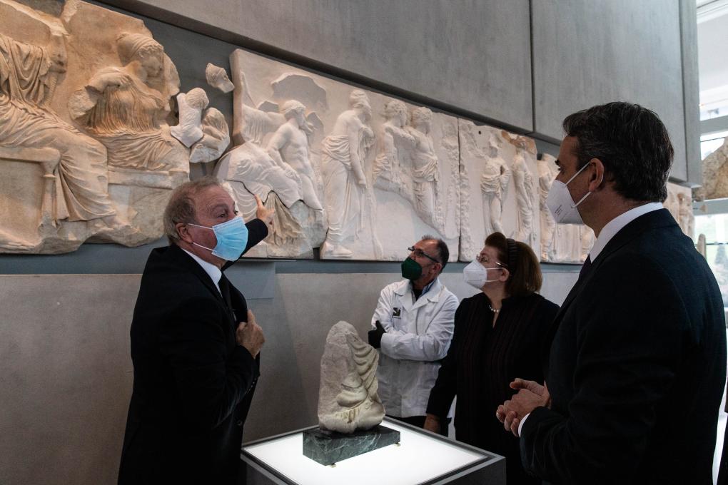 2022年1月10日,在希腊雅典卫城博物馆,希腊总理基里亚科斯·米佐塔基斯(右一)在观看一块原保存于意大利一家博物馆的雅典卫城帕特农神庙石雕碎片。新华社发(马里奥斯·罗洛斯摄)