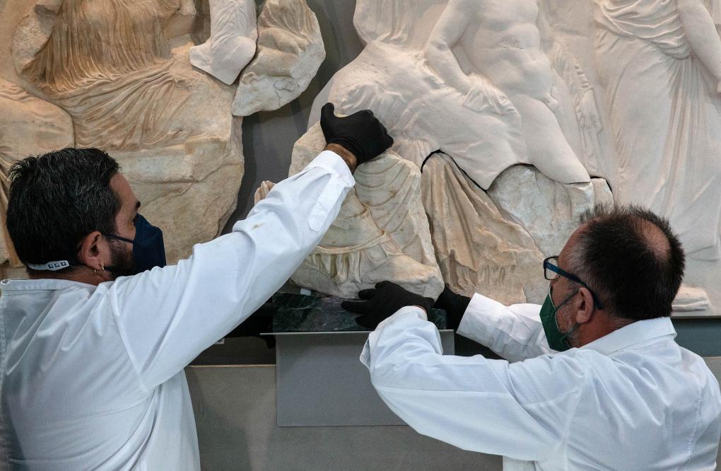 2022年1月10日,在希腊雅典卫城博物馆,工作人员正在将一块原保存于意大利一家博物馆的雅典卫城帕特农神庙石雕碎片放回原位。新华社发(马里奥斯·罗洛斯摄)