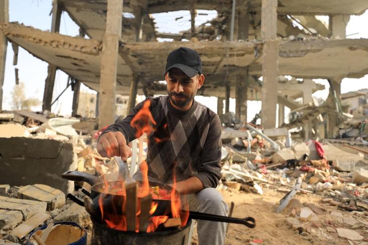 11月26日,在加沙地带南部城市汗尤尼斯,巴勒斯坦人在废墟旁做饭。新华社发(亚西尔·库迪摄)