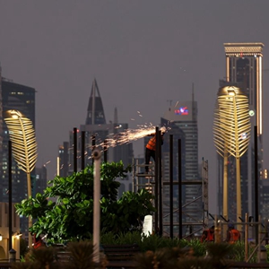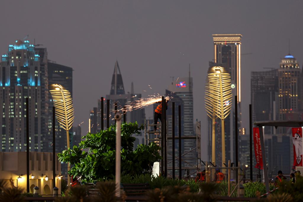 2022年11月8日,一名工作人员在多哈滨海大道的球迷广场忙碌。(新华社记者李明摄)