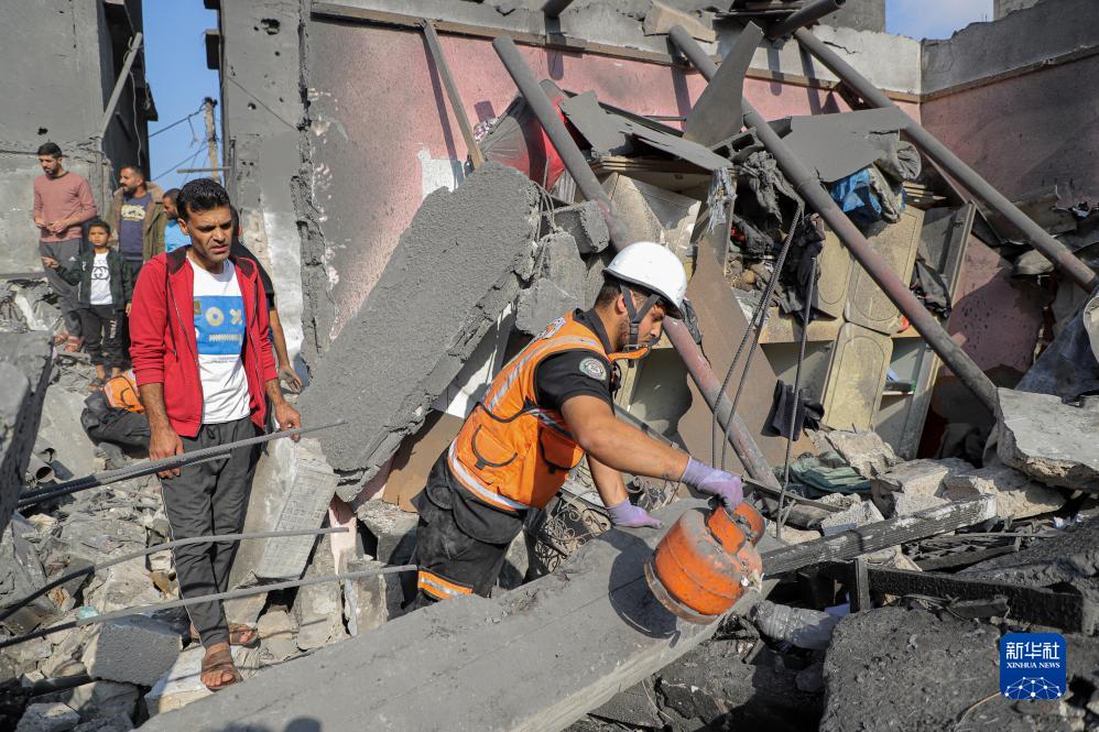 12月1日,在加沙地带南部城市汗尤尼斯,人们查看以军空袭后的废墟。