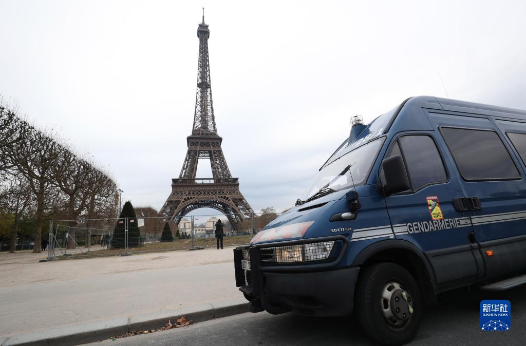 12月3日,一辆宪兵车辆停在法国巴黎埃菲尔铁塔附近。
