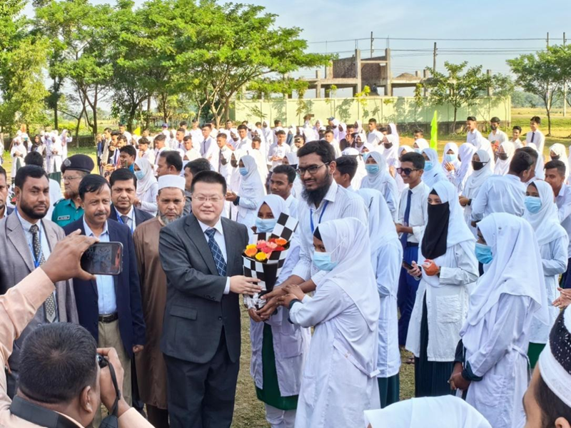 新华网达卡12月4日电(记者孙楠)中国驻孟加拉国使馆3日向索菲尔乌丁中学捐赠“智慧教室”。中国驻孟加拉国大使姚文、锡莱特专区副区长贾希姆、索菲尔乌丁中学校长艾哈迈德及师生代表等近千人参加捐赠“智慧教室”移交仪式。