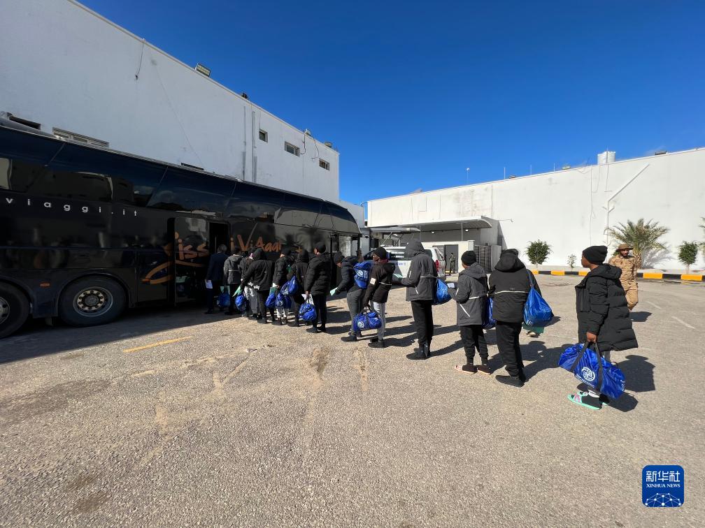 12月4日,非法移民在利比亚的黎波里登上一辆巴士。新华社发(哈姆扎·图尔基亚摄)